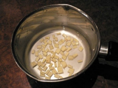 作り方(生サツマイモの場合)1…生のサツマイモを小さく切って水煮にする(小さいほうが早く煮える) |